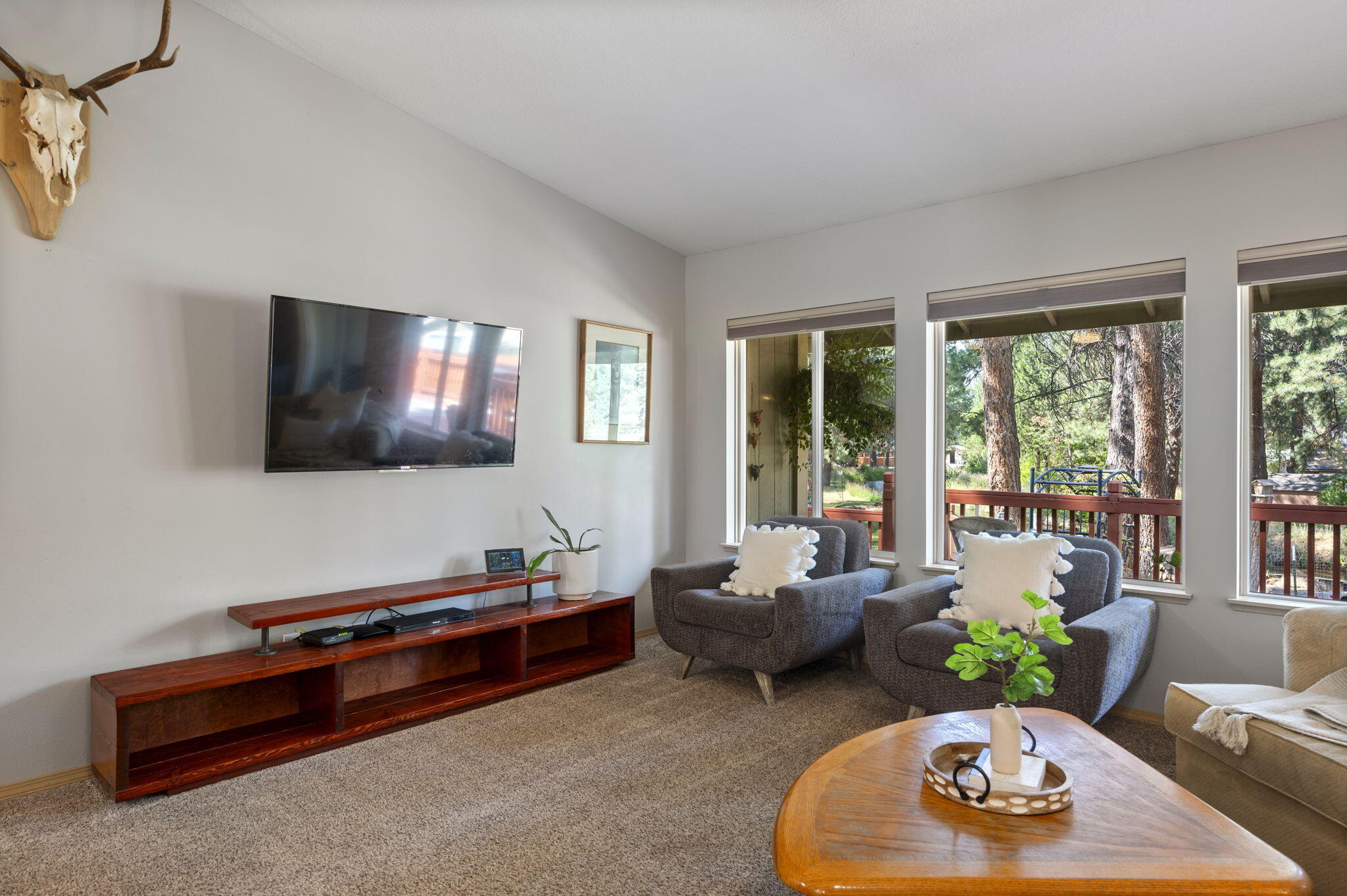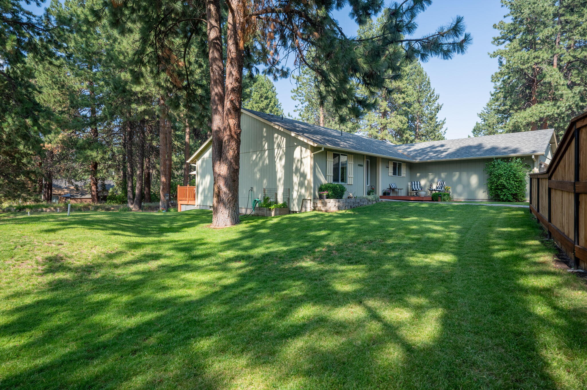 Set on a generous lot in Deschutes River Woods, this property is just what you've been looking for. The open-concept floor plan features high ceilings, large windows, and a breakfast bar in the kitchen, ideal for simultaneously cooking and entertaining guests. The primary bedroom is separated from the other two bedrooms, allowing maximum privacy. Expand the room and let the outdoors in with large french doors that open out onto the back deck that extends the entire length of the house. Plentiful storage and room for all of your Central Oregon toys in the two-car garage, shed, and side yard gravel parking. Landscaping includes a well-manicured lawn, fully fenced yard, timered sprinklers, garden area, mature trees, and more. Just outside the city limits of Bend, OR, enjoy all of the amenities of city life and then come home to your retreat in DRW.